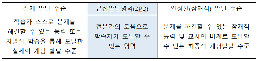 - 간단히 학습자의 능력(실제 발달 수준)과 전문가의 능력(완성된 발달 수준) 사이의 영역