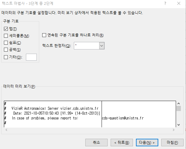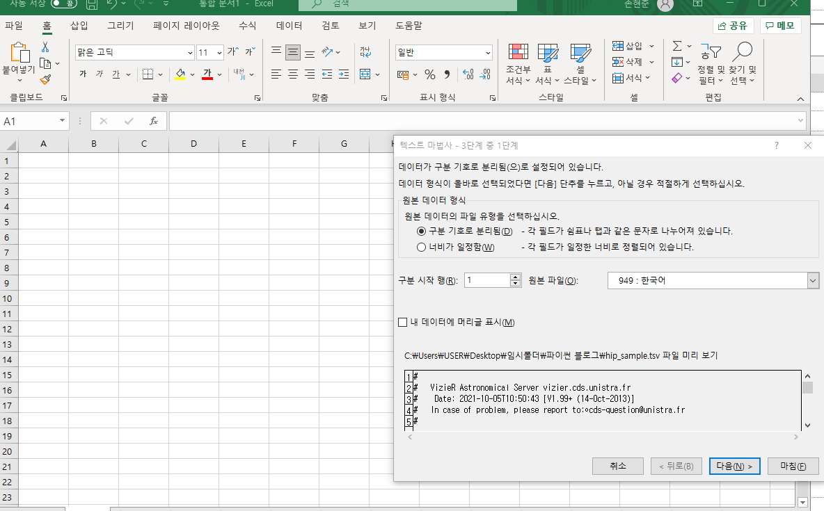 저장했던 tsv파일이 보입니다. 선택한 후 파일을 열어주시면 텍스트 마법사가 실행되며 아래의 그림처럼 보입니다.