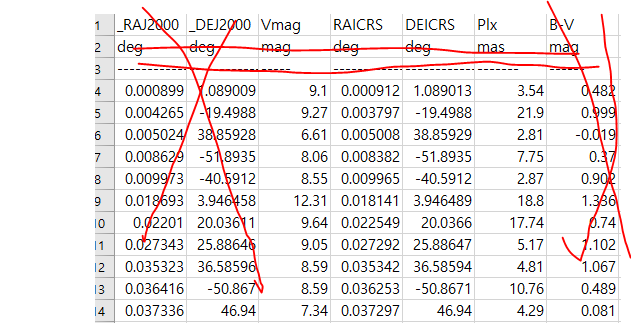 #이 있는 행을 모두 지우고 나면 변소들이 보입니다. 설정할 때 잘못해서 RAJ2000, DEJ2000, B-V라는 변수도 함께 생겼네요. 세 변수와 그 아래쪽에 단위를 표시한 행과 그 바로 밑에 ......으로 표시된 행까지 깔끔하게 지웁니다.
