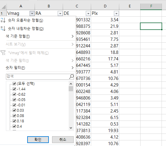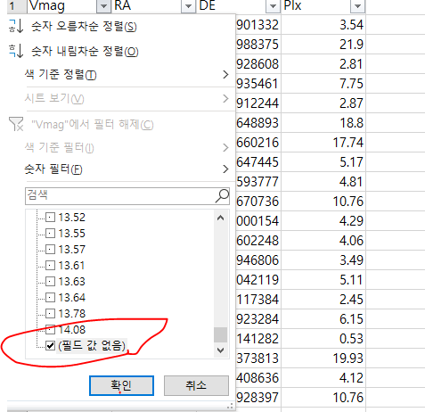 필터 표시의 조그만 역삼각형을 클릭하시면 '숫자 오름차순 정렬'이 보이고 아래쪽으로 쭉 내려가면 데이터 값이 보입니다.