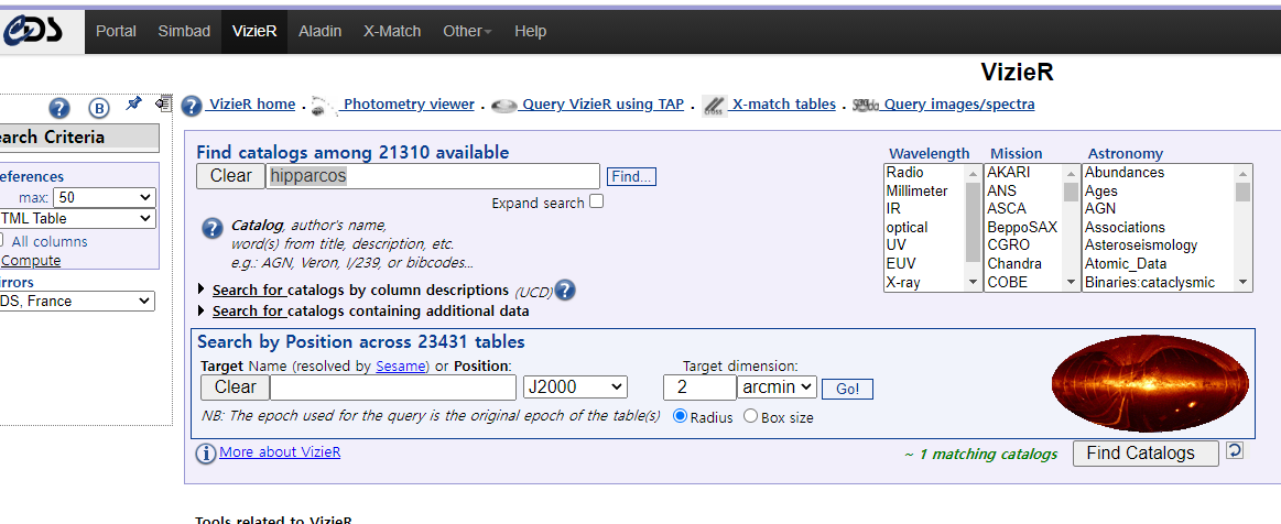히파르코스 카달로그를 다운받기 위해 검색창에 hipparcos를 치고 find를 누릅니다.