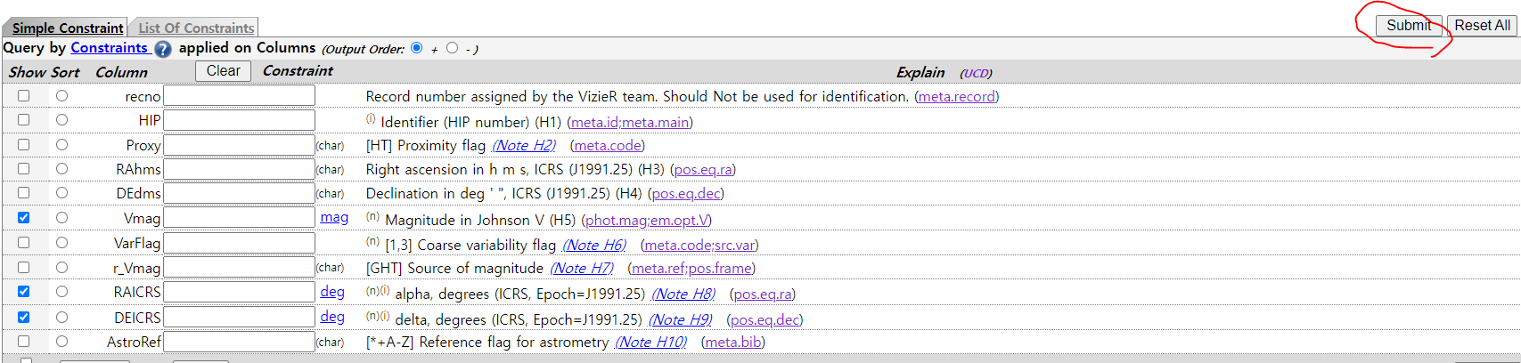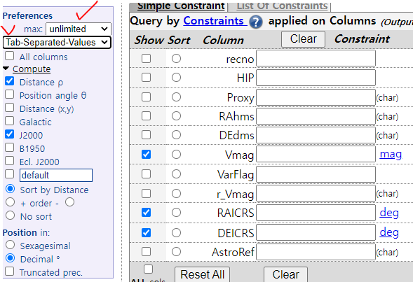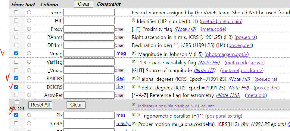 우리에게 필요한 정보는 적경과 적위, V등급, 연주시차이므로 나머지 항목은 모두 해제합니다.