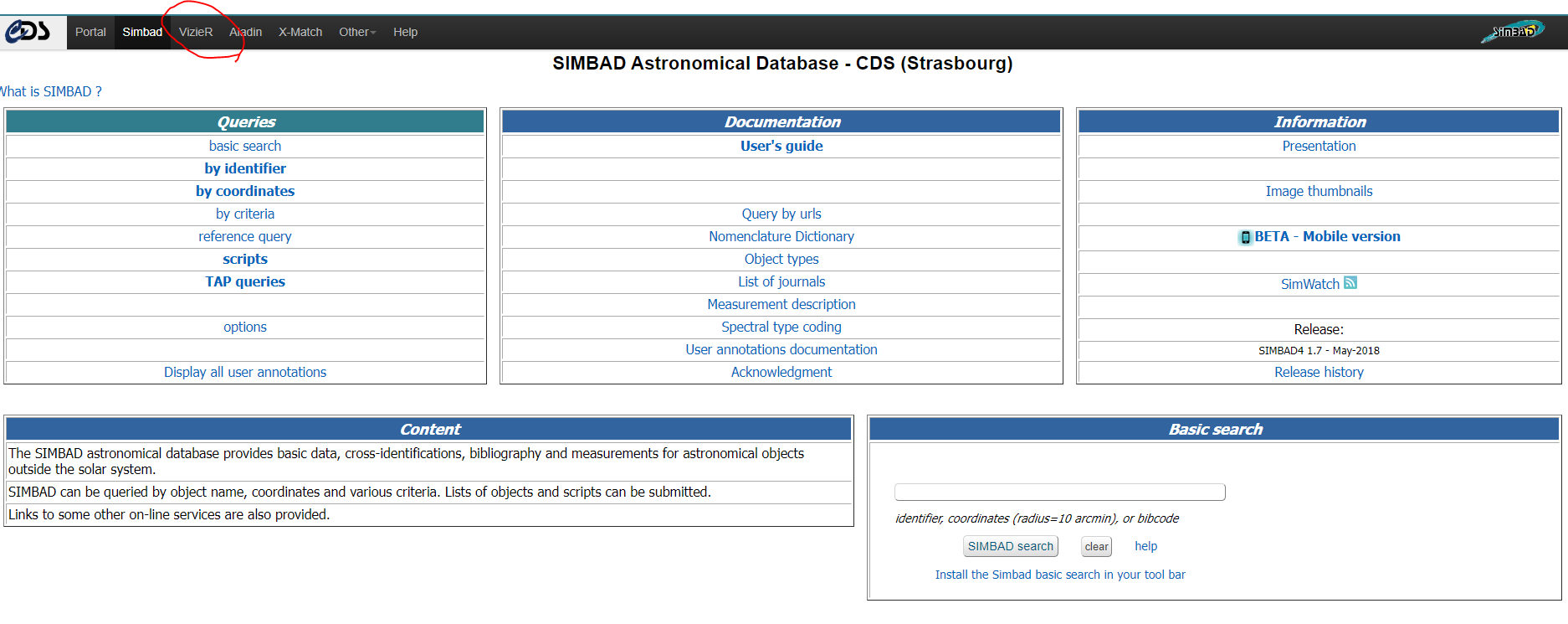 제일 처음에 검색되는 홈페이지로 접속한 후 VizieR 탭으로 이동합니다.