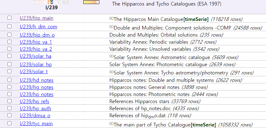 단, 적경과 적위는 각도로 표시된 항목을 다운로드해야 합니다. 아래 그림에서 체크할 항목을 표시하겠습니다.
