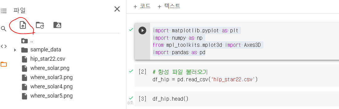 사전 작업으로 구글 코랩의 파일함을 열고 앞에서 저장했던 항성 데이터 파일을 업로드 합니다.